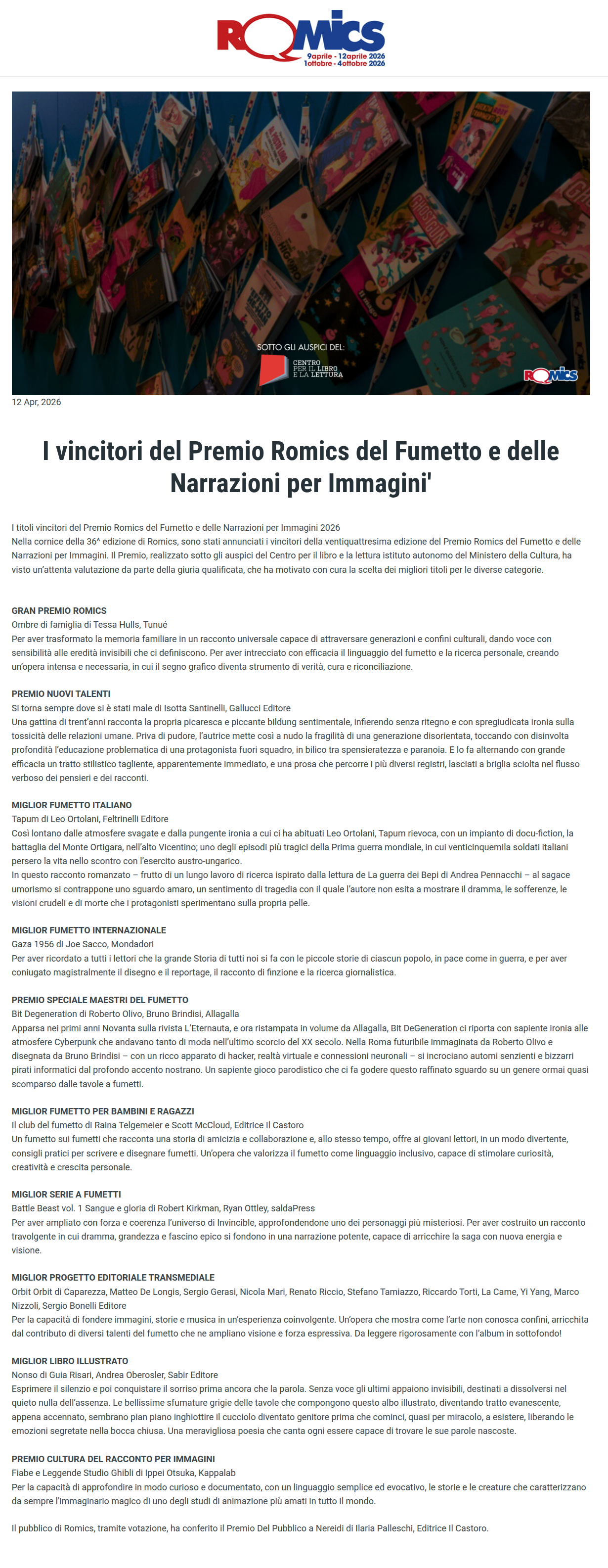 Premio Romics 2026,